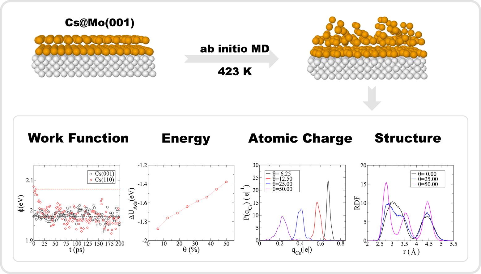 Ab initio molecular dynamics simulations have been conducted to investigate the properties of cesiated surface Mo(001) at the typical operating temperature of the negative hydrogen ion sources (423 K). In the systems with sub-monolayer Cs coverages (), both the mobility and ionicity of the adatoms decrease with . The computed shape of the work function () dependence on agrees with experiment, although our simulations underestimate the extent of the variation. In multilayer depositions, cesium forms two phases exhibiting distinctly different properties. The atoms laid directly on the substrate form an ordered layer with the atomic density and charges similar to those of the saturated monolayer (ML). A disordered phase with a much lower particle density is formed by the atoms stacked on the ordered layer and induces a positive shift in by 0.32 eV compared to ML. A similar behavior is observed for the Cs(001) and Cs(110) surfaces used as models for thick Cs depositions. The work function determined for multilayer Cs depositions at T=423 K is nearly independent of the substrate face and of the presence/absence of Mo, indicating that of such systems is fully determined by the disordered surface phase.