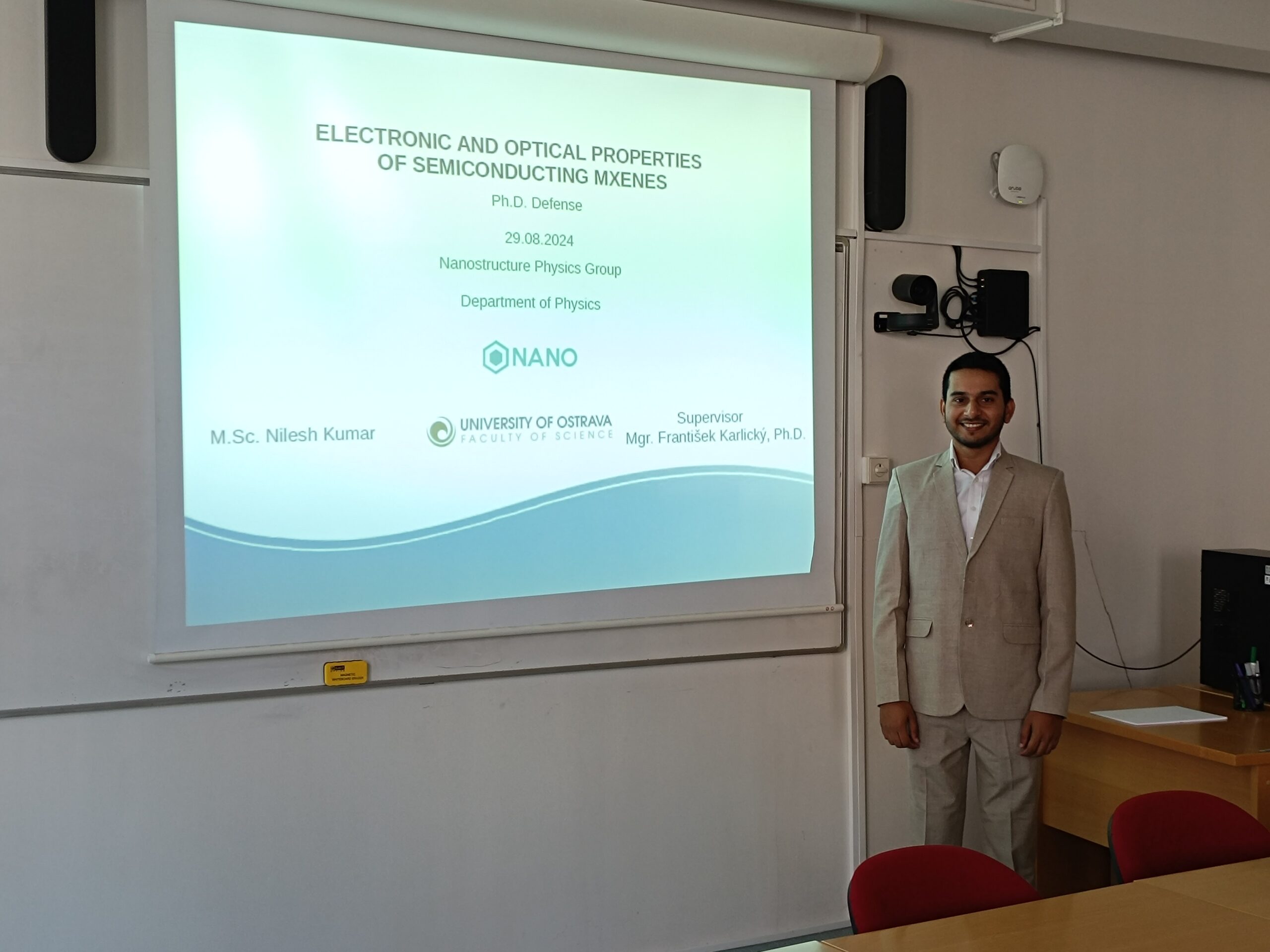 Dne 29. srpna 2024 náš PhD student Nilesh Kumar úspěšně obhájil svou disertační práci na téma “Elektronické a optické vlastnosti polovodivých MXenů” a tím završil své doktorské studium. Srdečně gratulujeme našemu v pořadí třetímu absolventovi a přejeme mu mnoho úspěchů v jeho budoucí vědecké kariéře!